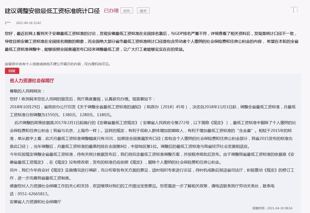 今年4月,有网友通过人民网领导留言板留言称,“近期我看到安徽省即将调整最低工资标准的新闻,在与全国其他省市对比中发现,安徽省的标准远远低于其他省份,原因是统计口径了剔除劳动者个人缴纳的社会保险费和住房公积金的内容,而绝大多数省份都是包含的,导致目前安徽工资标准在全国排名倒数的假象,与安徽省在全国的GDP排名严重不相符合。”