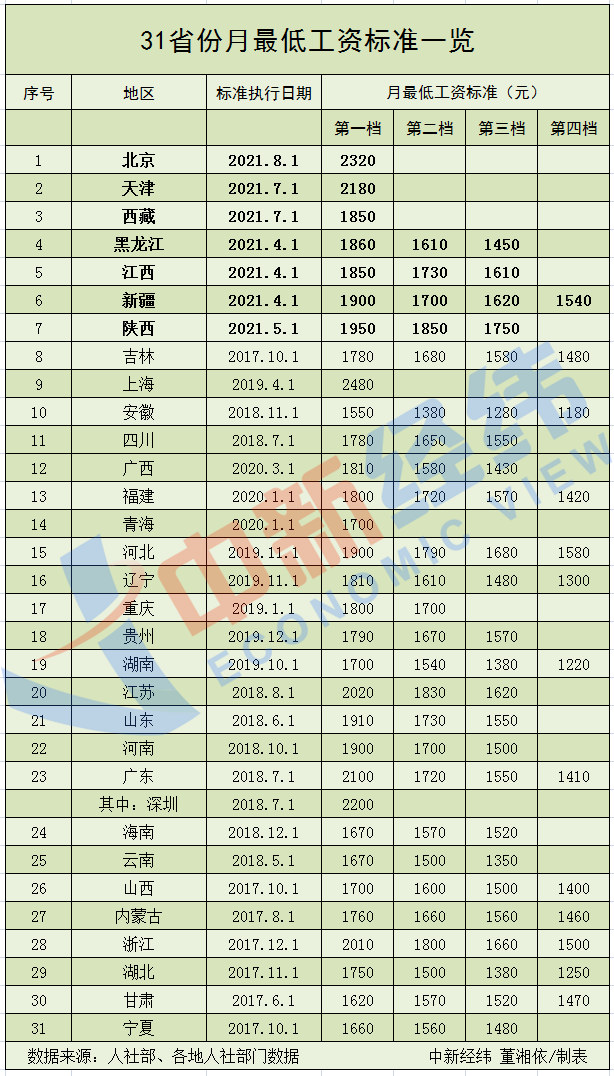 中新经纬客户端梳理发现,年内,包括北京在内,天津、江西、黑龙江、陕西、新疆、西藏陆续上调最低工资标准。