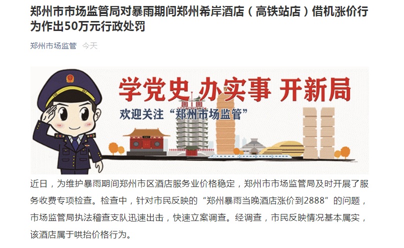 据“郑州市场监管”微信号23日凌晨消息,郑州市市场监管局对暴雨期间郑州希岸酒店(高铁站店)借机涨价行为作出50万元行政处罚。