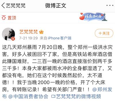 郑州市市场监管局郑重警告:希望全市所有宾馆酒店及所有经营者,在抗汛救灾的关键时刻,要承担社会责任,做到严格自律、依法经营,明码标价、规范经营,履行承诺、诚信经营。对发现的借机涨价、随意涨价等哄抬价格行为,市场监管部门将坚决依法从重从快查处,并提请有关部门实施联合惩戒。
