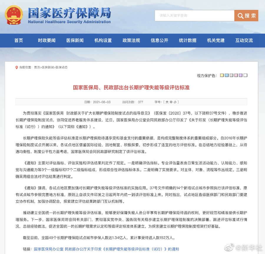 近日,国家医保局办公室会同民政部办公厅发出《关于印发〈长期护理失能等级评估标准(试行)〉的通知》,对评估指标、评估实施和评估结果判定作了规定,同时强调,各试点地区要加强对长期护理失能等级评估标准的实施应用。长期护理保险失能等级评估标准是长期护理保险待遇享受和基金支付的重要依据。截至目前,全国49个长期护理保险试点城市参保人数达1.34亿,累计享受待遇人数152万人。(记者彭韵佳、沐铁城)