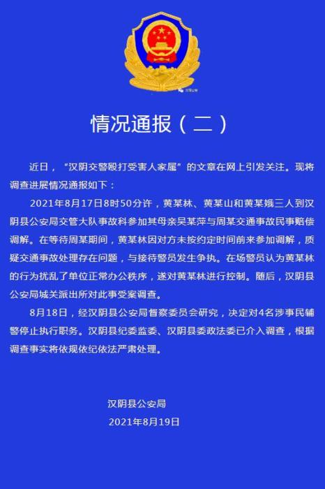 8月18日,经汉阴县公安局督察委员会研究,决定对4名涉事民辅警停止执行职务。汉阴县纪委监委、汉阴县委政法委已介入调查,根据调查事实将依规依纪依法严肃处理。