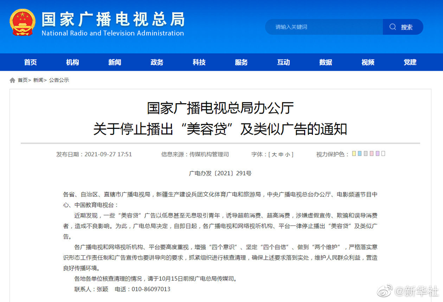 国家广播电视总局办公厅27日发出通知指出,近期发现,一些“美容贷”广告以低息甚至无息吸引青年,诱导超前消费、超高消费,涉嫌虚假宣传、欺骗和误导消费者,造成不良影响。为此,广电总局决定,自即日起,各广播电视和网络视听机构、平台一律停止播出“美容贷”及类似广告。(记者王鹏、白瀛)