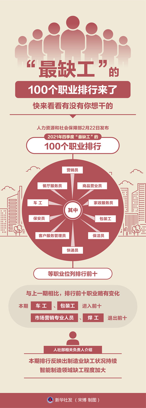 人力资源和社会保障部22日发布2021年四季度“最缺工”的100个职业排行,其中,营销员、餐厅服务员、商品营业员、车工、家政服务员、保安员、包装工、客户服务管理员、保洁员、快递员等职业位列排行前十。