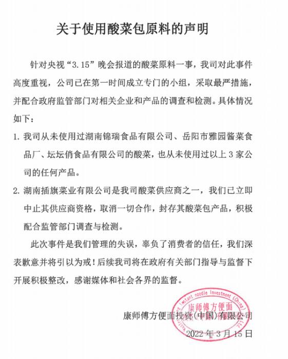 16日凌晨,康师傅发布声明致歉称:湖南插旗菜业有限公司是其酸菜供应商之一,已立即中止其供应商资格,取消一切合作,封存其酸菜包产品,积极配合监管部门调查和检测。此次事件辜负了消费者信任,深表歉意并将引以为戒。
