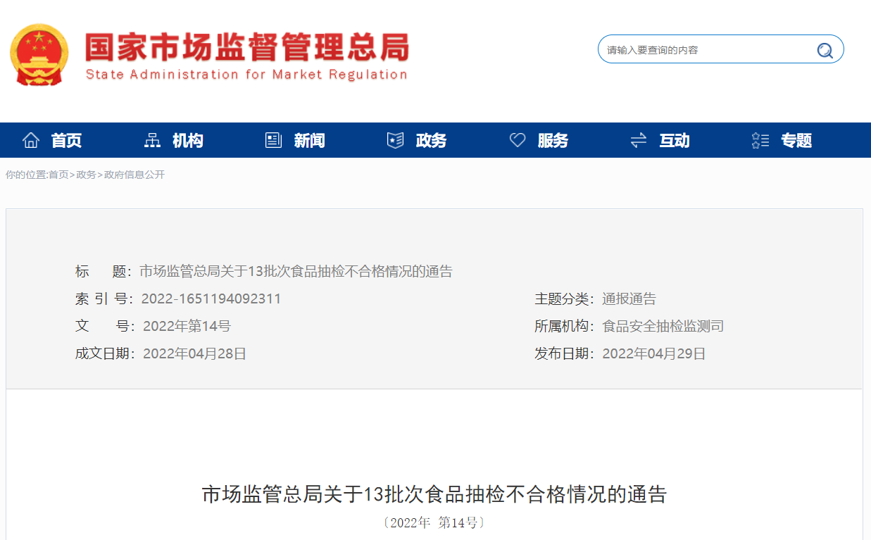 图片来源:市场监管总局官网人民网北京5月6日电 (记者杨曦)粮食加工品、食用农产品、食糖、茶叶及相关制品、乳制品、饮料、酒类、糕点、炒货食品及坚果制品、饼干、淀粉及淀粉制品……这些我们经常吃的食品都安全吗?近日,市场监管总局组织开展了食品安全监督抽检并发布通报。此次抽检发现,有9大类食品13批次样品不合格。