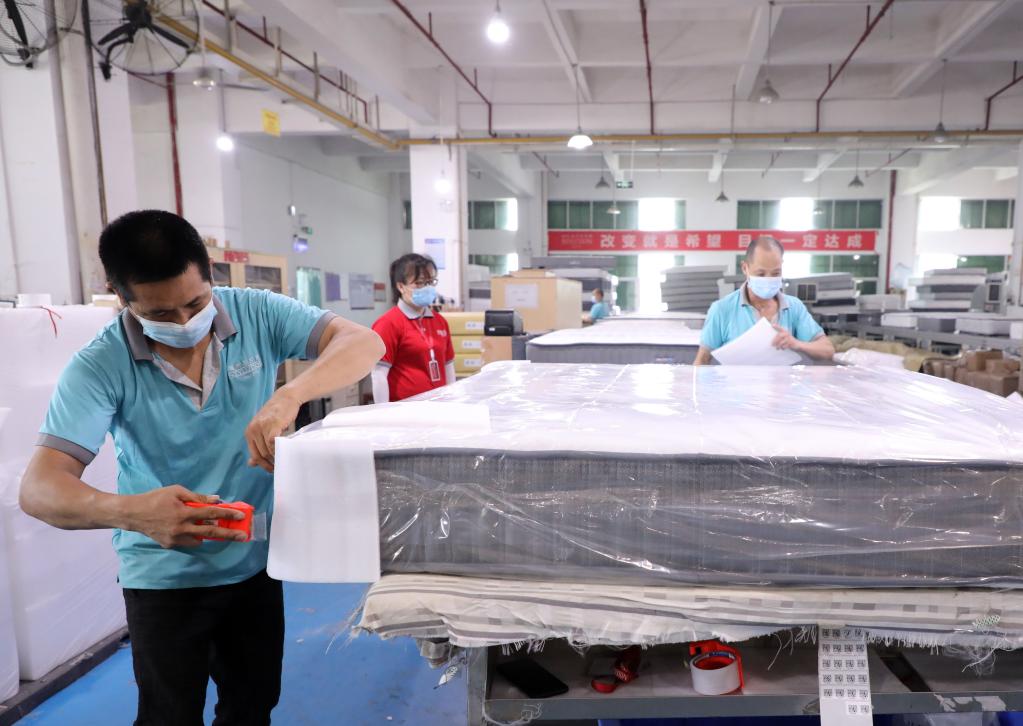 运时通(中国)家具有限公司员工正在做产品包装(2022年4月27日摄)。新华社记者 黄国保 摄