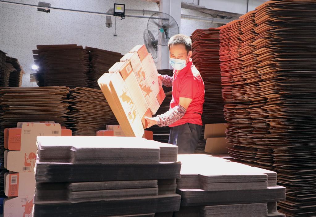东莞市顺丰纸品制造有限公司员工正在装运产品(2022年4月28日摄)。 新华社记者 黄国保 摄