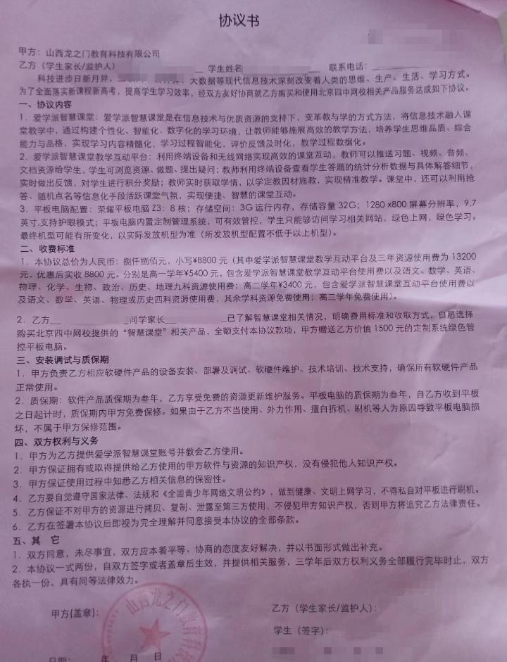 家长与山西龙之门教育科技有限公司签署的协议。(国务院第九次大督查第一督查组供图)