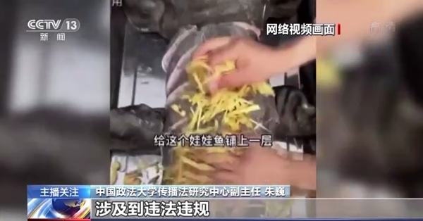 该段视频全程都在左上角标注“人工养殖可食用”,但专家指出,标注“人工养殖”并不能作为主播规避违法风险的凭仗。