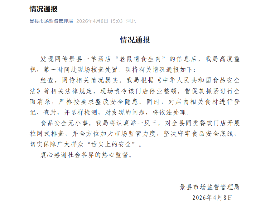 据“景县市场监督管理局”微信公众号消息,4月8日,河北衡水景县市场监督管理局发布情况通报:发现景县一羊汤店“老鼠啃食生肉”的信息后,景县市场监督管理局高度重视,第一时间赴现场核查处置。