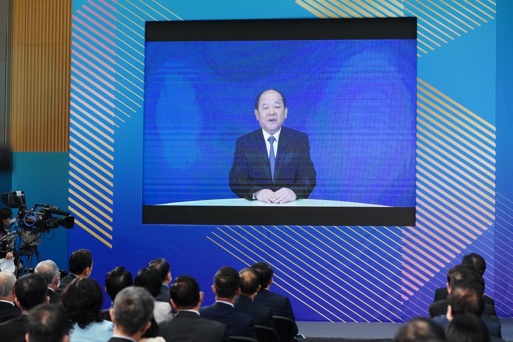 8月23日,在香港特区政府总部,国家发展改革委副主任宁吉喆通过视频致辞。新华社记者 王申 摄