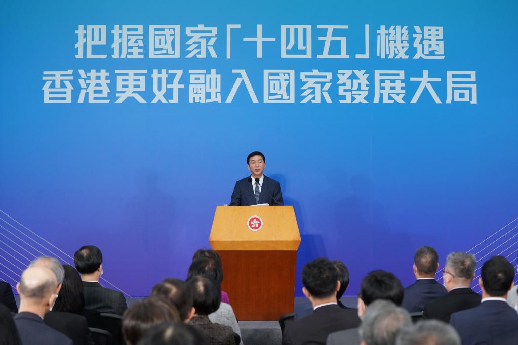 8月23日上午,国家“十四五”规划宣讲团首场宣讲活动在香港特区政府总部举行,与会人士围绕“把握国家‘十四五’机遇 香港更好融入国家发展大局”,深入研讨国家政策给香港带来的新机遇。香港特区行政长官林郑月娥、香港中联办主任骆惠宁、国家发展改革委副主任宁吉喆、国务院港澳办副主任黄柳权发表致辞,香港特区政府官员、行政会议成员、主要大学校长等160余名嘉宾与会。