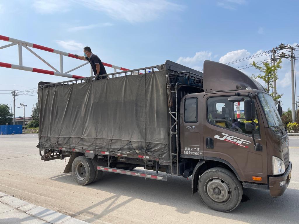 督查组前往营口市中小企业园暗访,在位于园区附近的新新路南端发现了一处限高杆。短短10分钟,有7辆货车经过,车身较高的货车必须以非常慢的速度通过。其中一辆货车上只有司机一人,不得不频繁下车观察、上车操作,反复确认车辆与限高杆高度,最后徒手爬上车,拆除车厢防雨布挡板后才勉强通过。