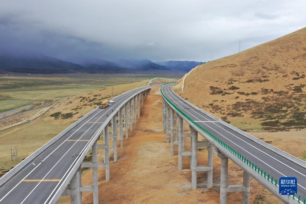 西藏拉萨市当雄县境内由中铁城投承建的京藏高速那曲至羊八井段堆巴果大桥(5月29日摄,无人机照片)。新华社发(胡雪峰 摄)