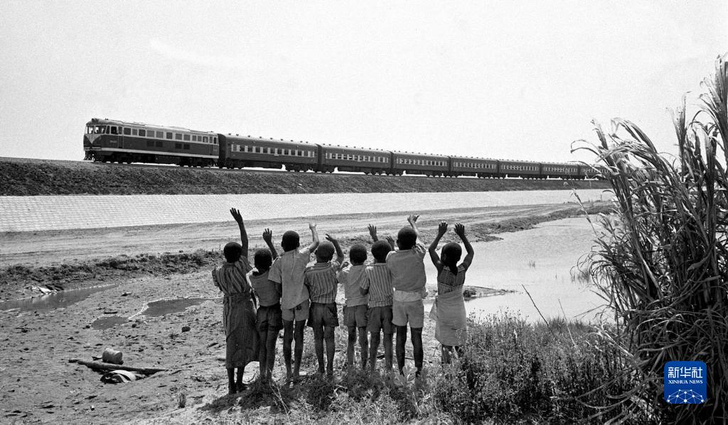 赞比亚鲁西瓦西湖畔的少年儿童欢迎坦赞铁路的列车通到他们的家乡(1976年摄)。新华社发