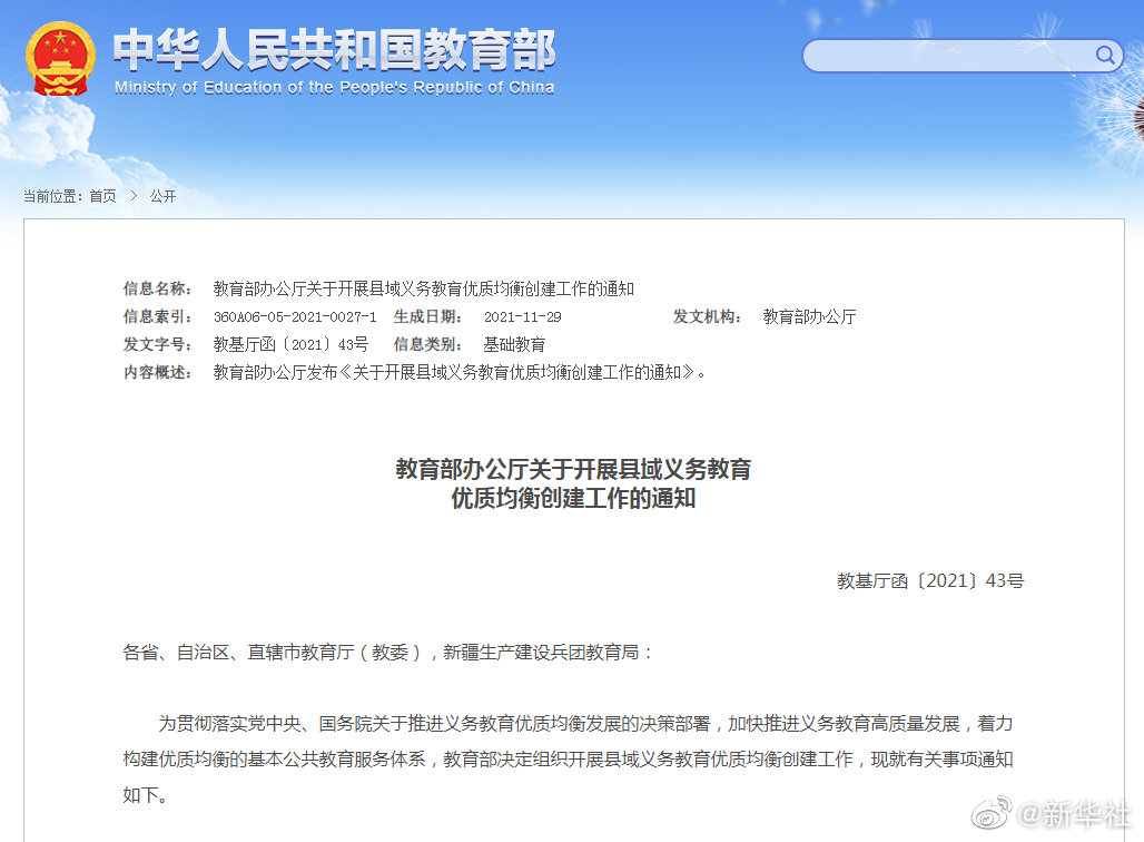 记者12月1日从教育部网站获悉,教育部办公厅发布《关于开展县域义务教育优质均衡创建工作的通知》,指出经过3—5年的努力,在各省(区、市)创建一批率先实现义务教育优质均衡发展的县(市、区)。通知明确优质均衡创建工作的攻坚清单,包括健全扩大学校办学自主权、激发学校办学活力的机制,出台校长教师交流轮岗、促进师资均衡配置的实施办法,制订加强随迁子女、留守儿童、残疾儿童等特殊学生群体教育关爱的制度措施等。(记者王鹏)
