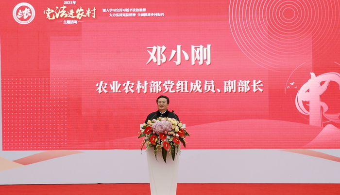 本网讯 12月16日,农业农村部、司法部在四川省成都市蒲江县明月村举办2021年“宪法进农村”主场活动。农业农村部党组成员、副部长邓小刚,四川省副省长尧斯丹出席活动并致辞,农业农村部国家首席兽医师(官)李金祥出席活动。