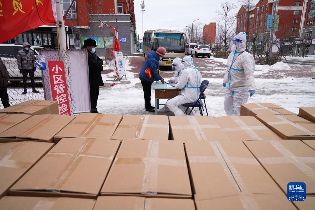 在黑龙江省黑河市爱辉区一小区,社区工作人员为居民发放免费生活物资(11月10日摄)。新华社记者 王松 摄