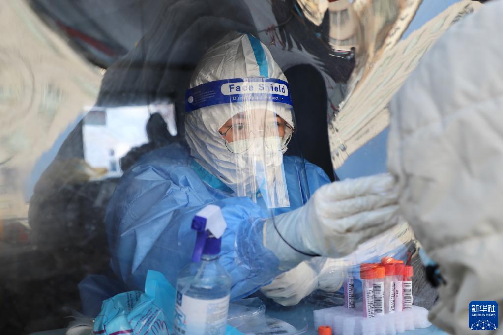 1月27日,在黑龙江绥芬河市一处核酸采集点,医护人员对居民进行核酸采样。新华社记者 徐凯鑫 摄
