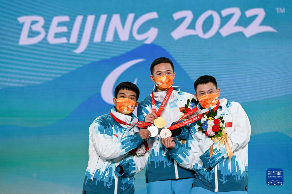 3月7日,中国选手冠军纪立家(中)、亚军王鹏耀(左)和季军朱永钢在北京2022年冬残奥会残奥单板滑雪男子障碍追逐(UL级)比赛奖牌颁发仪式上。新华社记者 胡超 摄