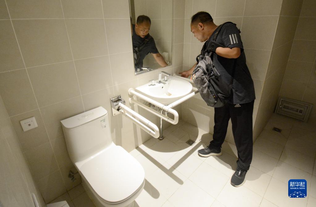 图为无障碍专家在北京延庆赛区冬奥村检查室内卫生间无障碍设施(2021年7月15日摄)。新华社记者 李欣 摄