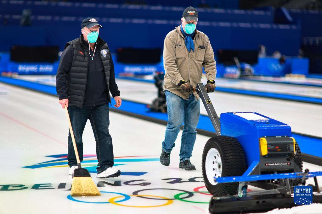 图为加拿大的制冰师汉斯·乌斯里奇(左)在“冰立方”指导团队成员使用制冰设备(2022年1月28日摄)。新华社记者 刘续 摄