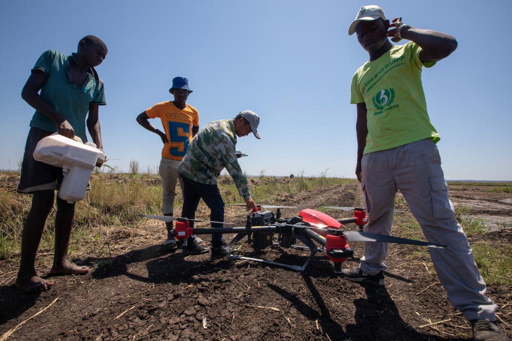 2019年11月28日,在莫桑比克的万宝莫桑农业园,中国农业专家(右二)指导当地工人使用无人机喷洒除草剂。新华社记者 张宇 摄