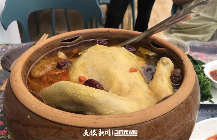 在先才陶艺馆的不远处,便是一家制作盬子鸡的餐馆,此时老板陈义兵正忙着招呼客人,在餐馆的院子里,一罐罐盬子鸡正滋滋冒着白气,诱人的香味也弥漫在空气之中。