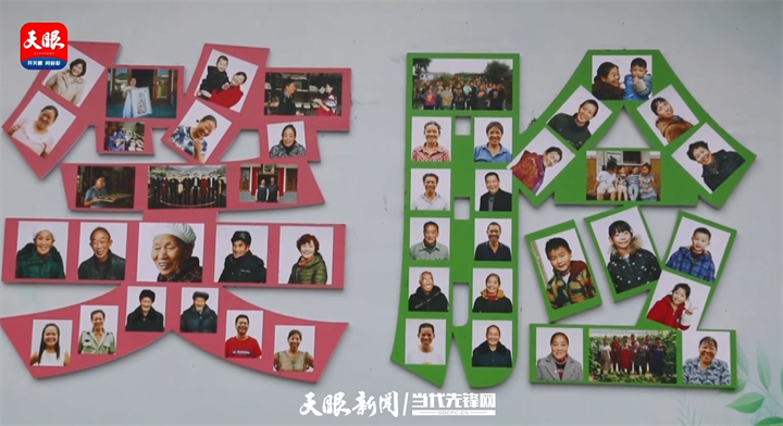 墙上是一张张村民的笑脸照,顺着粉色和绿色的笔画,拼成了大大的“笑脸”二字。