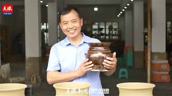 “我现在正在做的是咱们花茂村的传统土陶……”花茂村土陶技艺第四代传承人母先才向游客介绍道,手上的动作也没停,只见他轻揉泥团,在木轮上转圈。不一会儿,一个精致的陶制坛子就成型了。