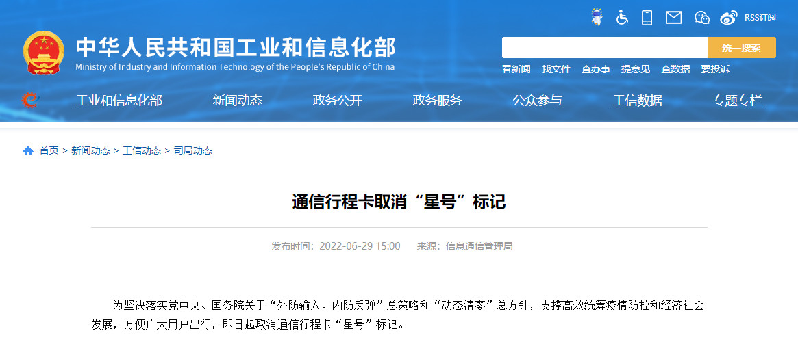 据工信部网站消息,为坚决落实党中央、国务院关于“外防输入、内防反弹”总策略和“动态清零”总方针,支撑高效统筹疫情防控和经济社会发展,方便广大用户出行,即日起取消通信行程卡“星号”标记。
