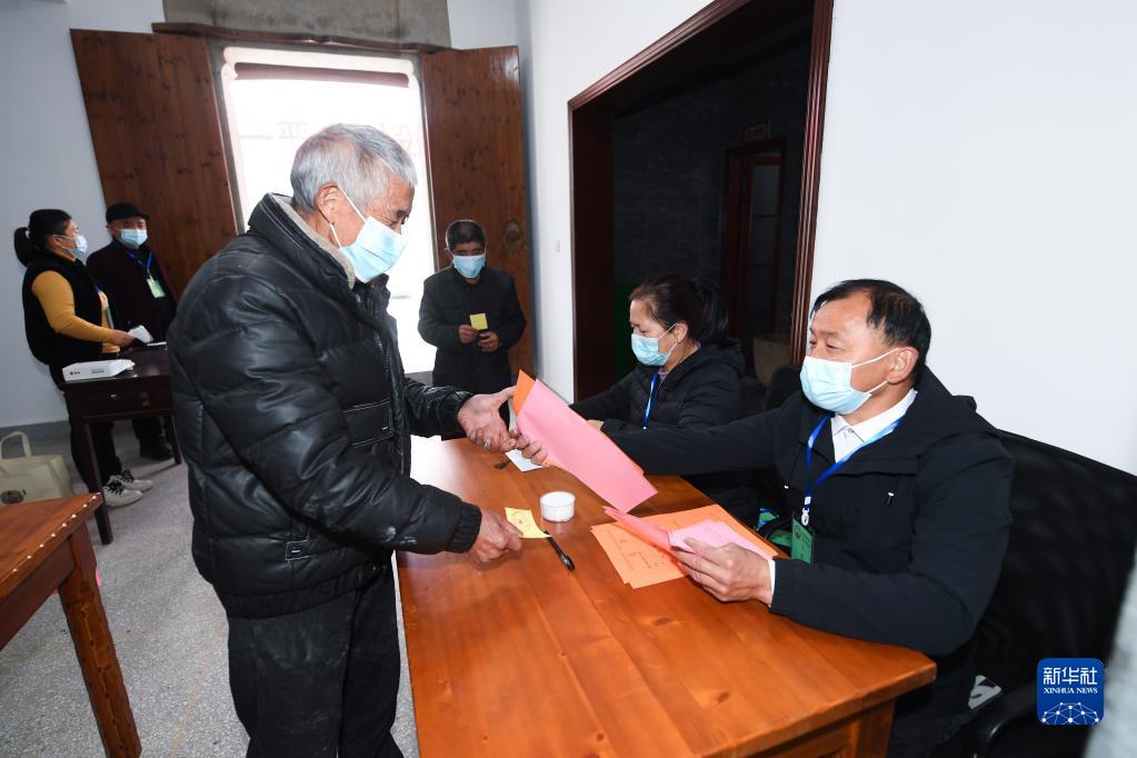 村民在浙江省杭州市临安区湍口镇迎丰村的基层投票点领取选票参加基层人大换届选举投票(2021年12月14日摄)。新华社记者 徐昱 摄