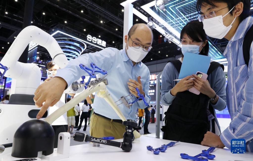 2022年9月1日,工作人员(左一)向参观者介绍微创骨科手术机器人。当日,2022世界人工智能大会在上海世博中心拉开帷幕。新华社记者 方喆 摄