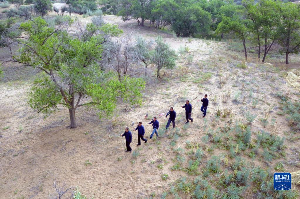 在甘肃省武威市古浪县八步沙林场,场长郭万刚(左一)和大家一起前往治沙点(2019年8月23日摄,无人机照片)。新华社记者 范培珅 摄