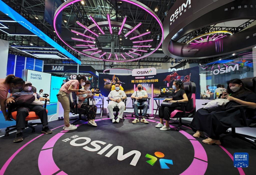 观众在第二届中国国际消费品博览会上体验按摩电竞椅(2022年7月28日摄)。新华社记者 郭程 摄