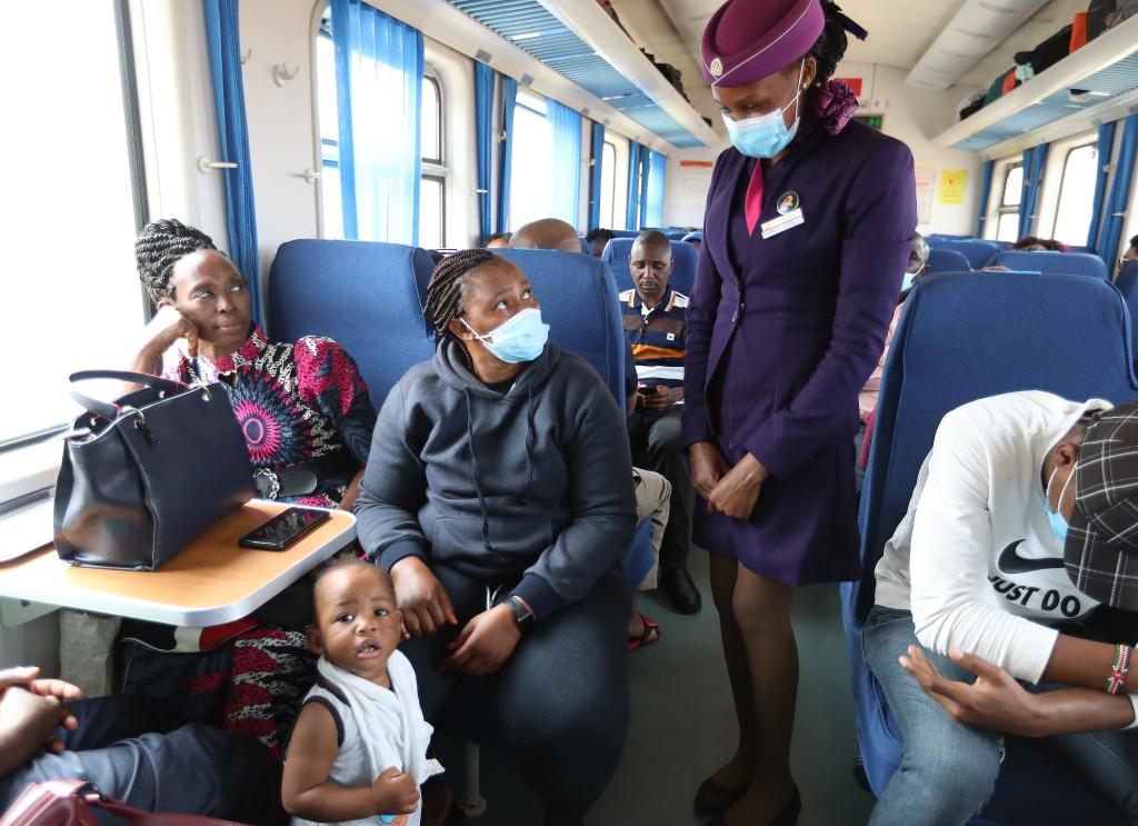 7月29日,列车员菲奥娜(站立者)在蒙内铁路客运列车上与乘客交流。新华社记者董江辉摄